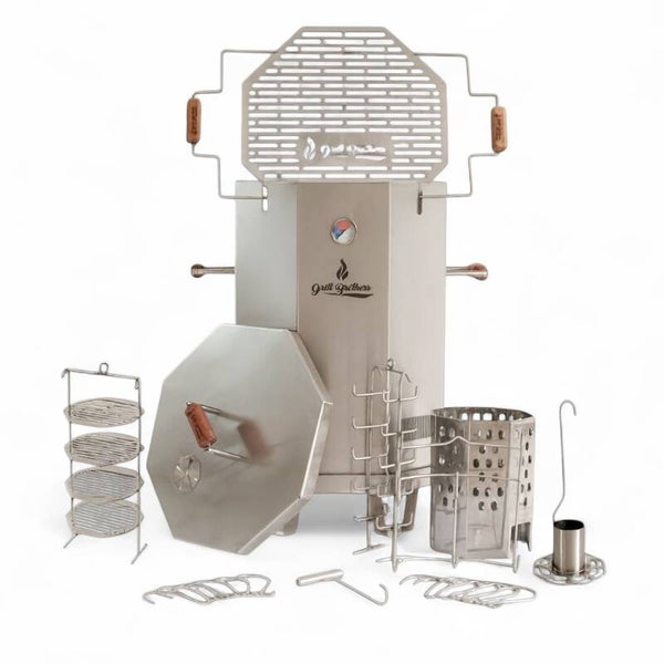 - Comprehensive Grill Kit: Comes complete with essential components, including 12 hooks for customizable grilling, a practical hook remover, a main grill, a dedicated burner container for charcoal, and an integrated thermometer.