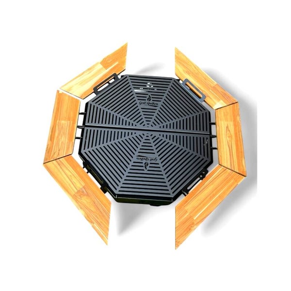Grill stoker, designed for sharing with family and friends, enjoy a fire and grill night ideal for all lovers of fire and embers. Made of 3mm Iron, teak wood table supports.